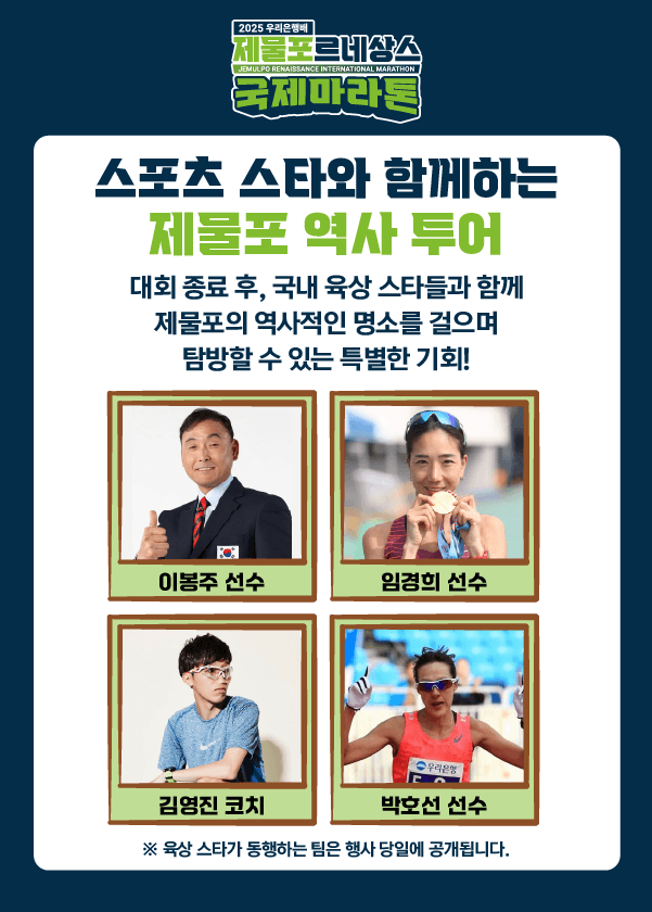 4명의 육상 스타들과 함께하는 제물포 역사 투어에 많은 관심과 참여 부탁드립니다.