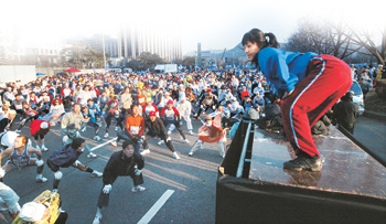 풀코스 완주를 위해서는 기록 단축보다 즐겁게 달린다는 마음가짐을 갖는 게 더 중요하다. 대회 열흘을 앞두고는 훈련량 조절과 식이요법을 병행하는 게 좋다. 사진은 출발 전 스트레칭으로 몸을 풀고 있는 모습