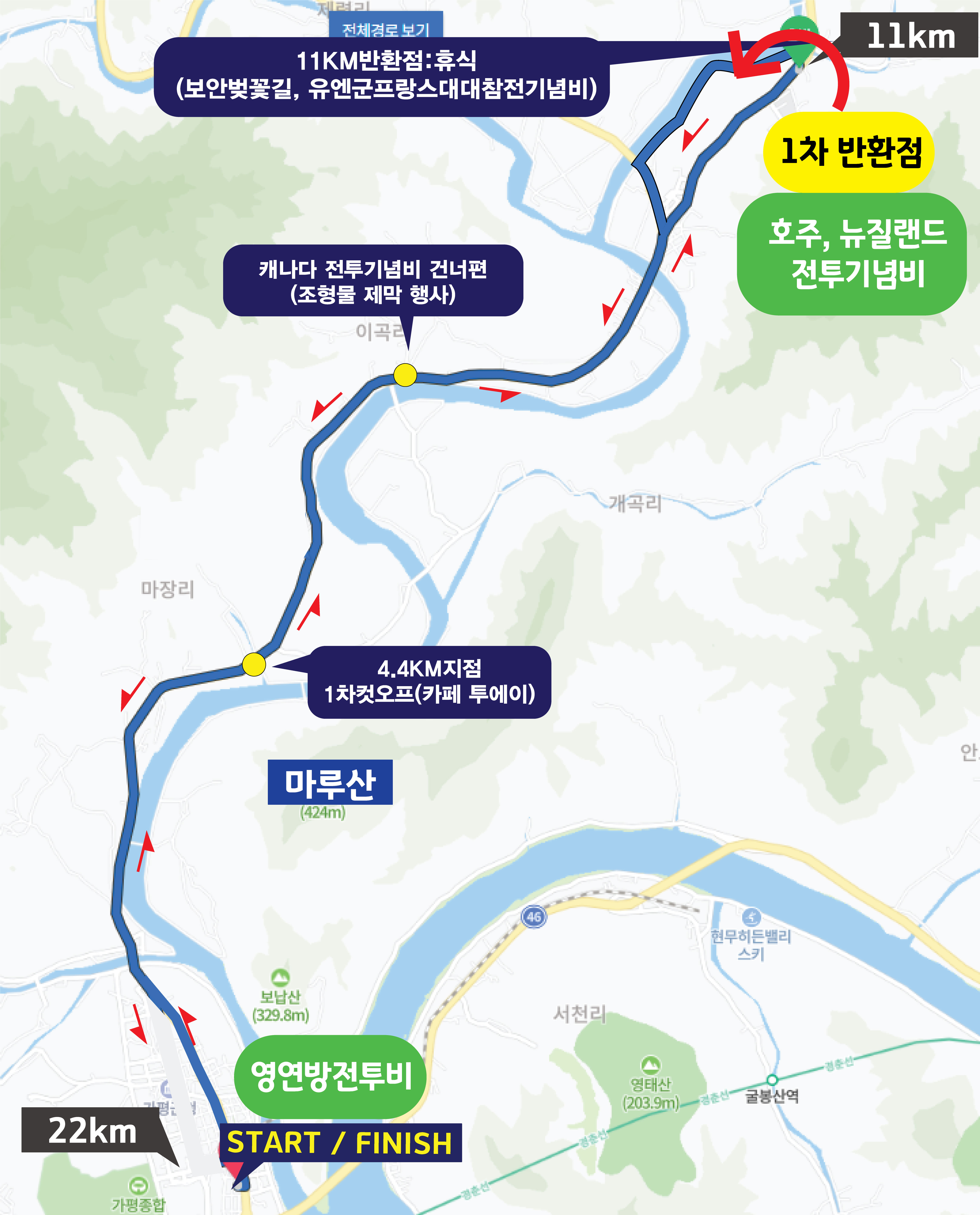 영연방 전투기념비 출발 –캐나다 전투기념비 - 가화로 – 화악산로 가평 읍내 – 호주,뉴질랜드 전투 기념비 반환 – 영연방 전투기념비 도착