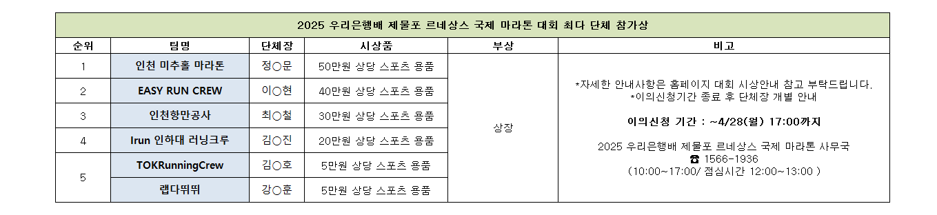 [시상 안내] 2025 우리은행배 제물포 르네상스 국제 마라톤 최다단체참가상 입상팀 안내