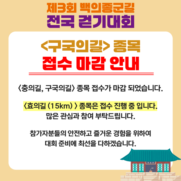안녕하세요. 제3회 백의종군길 전국 걷기대회 사무국입니다.